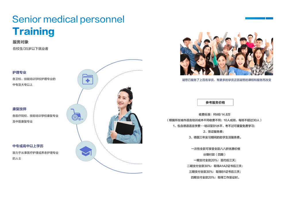 中德高级医护人才培养项目致力于帮助国内有意愿到德国发展或者有志在国内高端医疗/养老机构内从事管理等工作的人群提供一站式服务平台,为医疗护理专业技能人才搭建赴德国(欧洲)就业、深造及全家移民的桥梁!咨询电话: 张经理18600865994